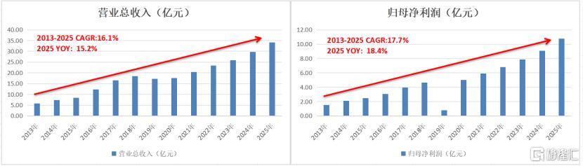 业绩稳健增长,穿越经济波动周期2025年,公司实现营业收入34.17亿元,同比增长15.2%,归母净利润10.78亿元,同比增长18.4%,净利润加速增长,盈利能力进一步增强。